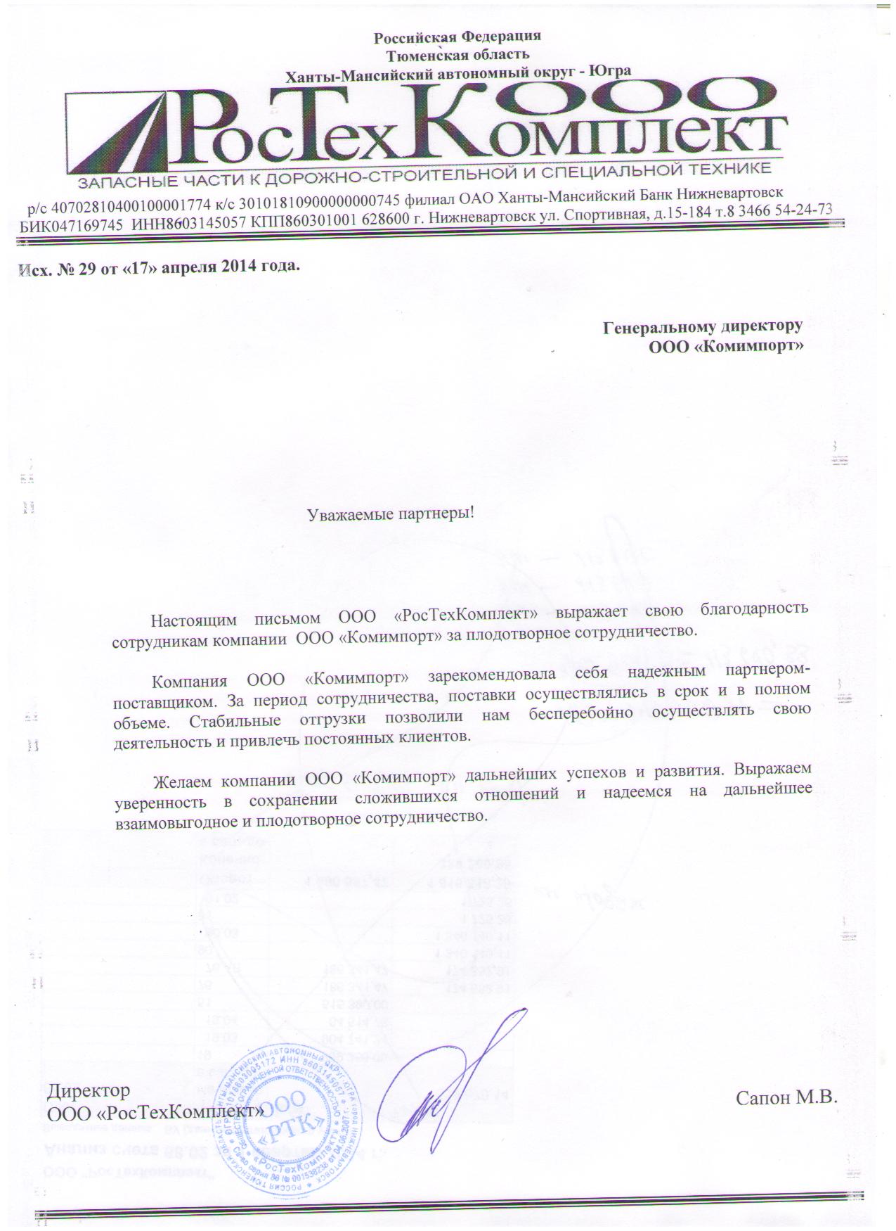 Уважаемые партнеры! Этим письмом ООО «РосТехКомплект» выражает свою благодарность сотрудникам компании ООО «Комимпорт» за плодотворное сотрудничество. Компания ООО «Комимпорт» зарекомендовала себя надежным партнером-поставщиком. За период сотрудничества поставки осуществлялись в срок и в полном объеме. Стабильные отгрузки позволили нам бесперебойно осуществлять свою деятельность и привлечь постоянных клиентов. Желаем компании ООО «Комимпорт» дальнейших успехов и развития. Выражаем уверенность в сохранении сложившихся отношений и надеемся на дальнейшее взаимовыгодное и плодотворное сотрудничество.
