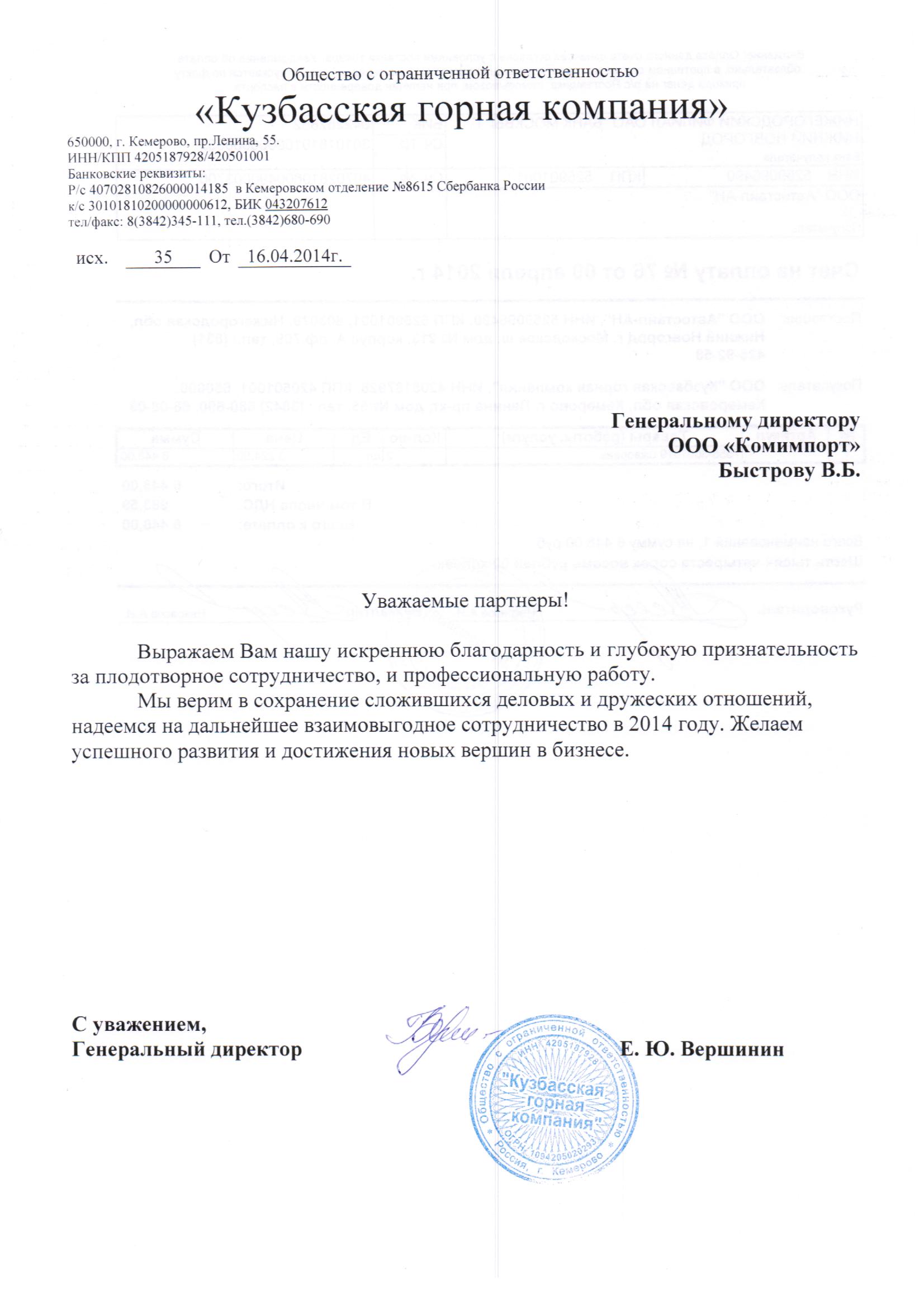 ООО «МеталлоИнвест» благодарит коллектив компании ООО «Комимпорт» и Вас лично за успешное и плодотворное сотрудничество с нами. За период нашей совместной работы компания ООО «Комимпорт» зарекомендовала себя как надежный поставщик качественной продукции способный выполнять сложные задачи на высоком профессиональном уровне. Искренне желаю Вам и Вашей компании процветания и дальнейших успехов в реализации новых проектов.